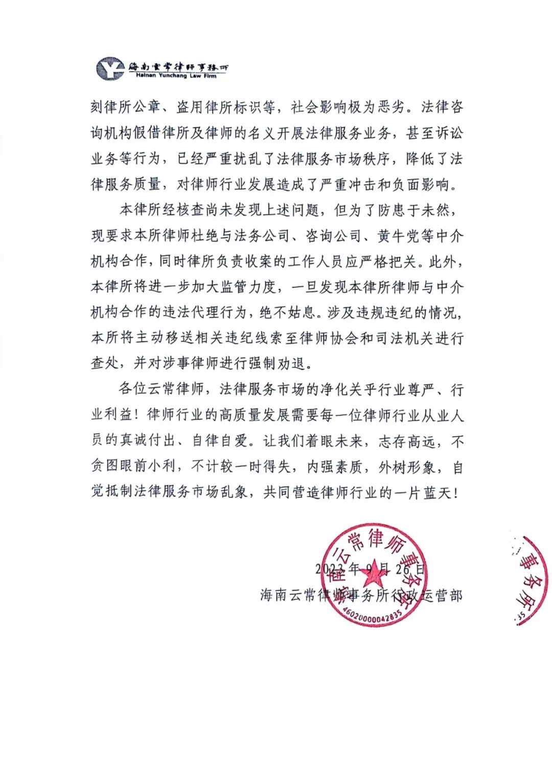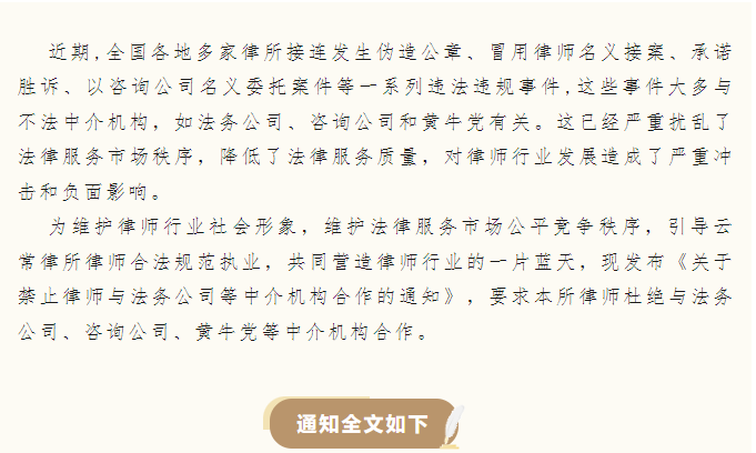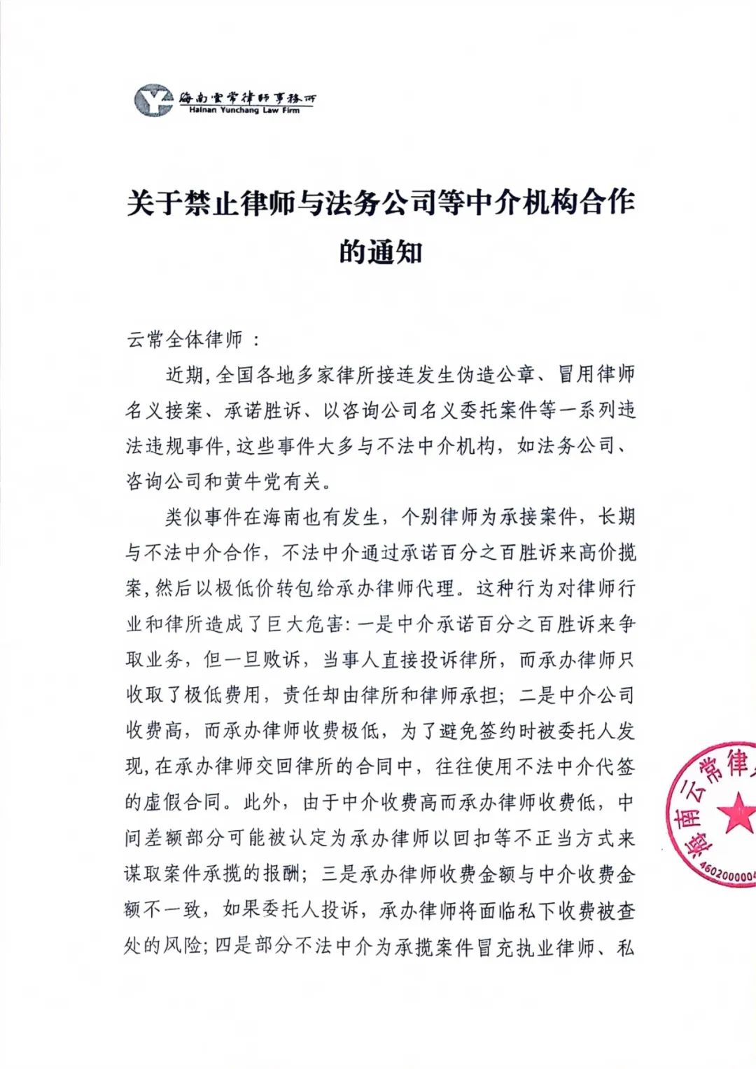海南云常律师事务所关于禁止律师与法务公司等中介机构合作的通知