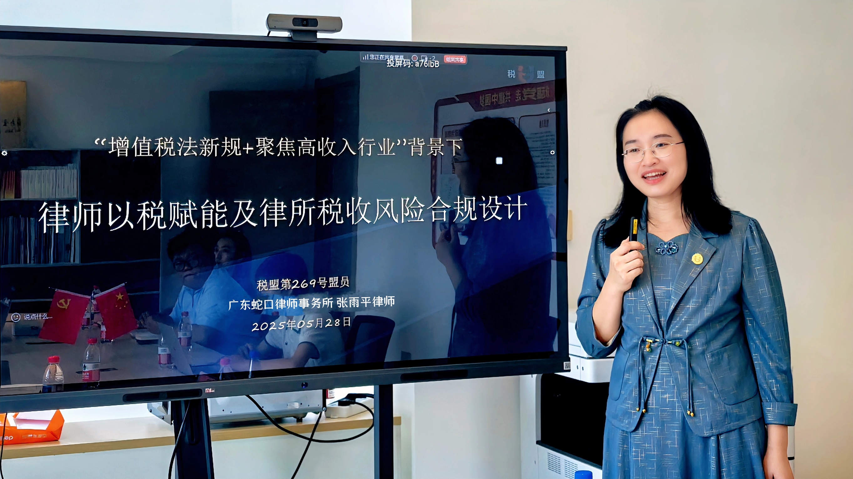 2025年5月28日,广东蛇口律师事务所张雨平律师做客海南云常律师事务所,在介绍“增值税法新规+聚焦高收入行业”背景下,向我所分享了律师以税赋能及律所税收风险合规的专题沙龙,为我所律师“以税赋能”提供了切实启示与实践路径。
