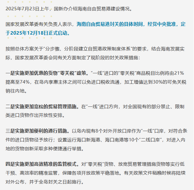 海南自贸港资讯之封关进入倒计时!海南自由贸易港将于2025年12月18日正式启动封关运行