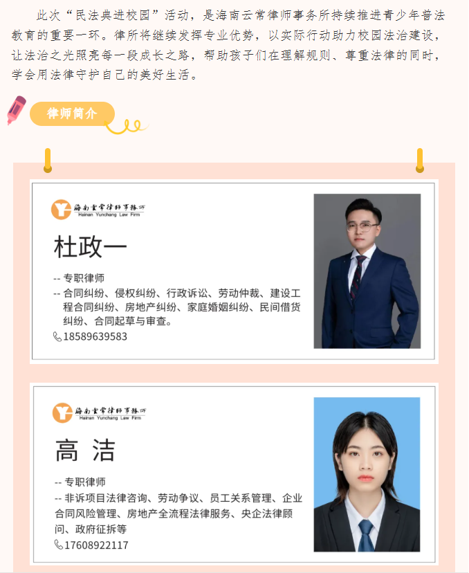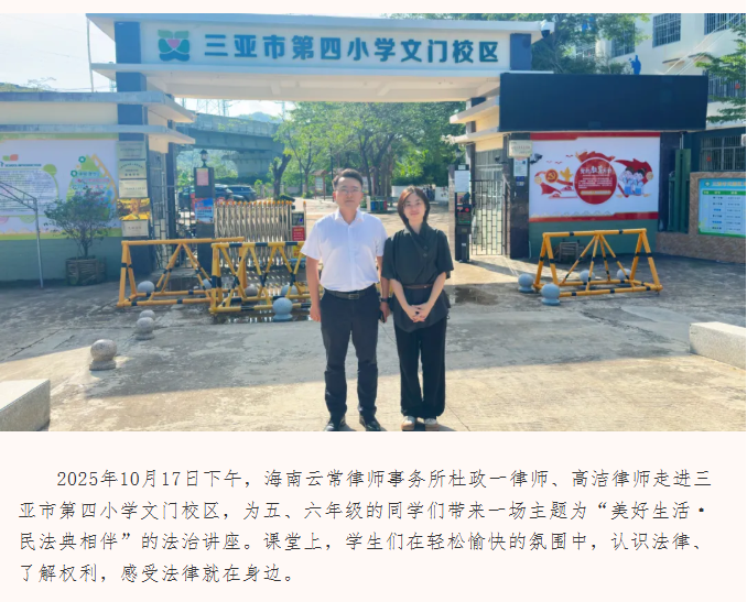 云常普法 | 美好生活·民法典相伴——海南云常律师事务所杜政一律师、高洁律师走进三亚市第四小学文门校区开展普法课堂