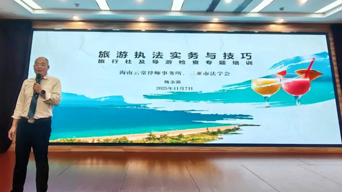 为进一步强化旅游市场监管执法能力,助力旅游执法规范化、专业化建设,11月7日,海南云常律师事务所律师魏金强受三亚市综合行政执法局吉阳分局邀请,开展主题为《旅游执法实务与技巧:旅行社及导游检查专题培训》的专题讲座。