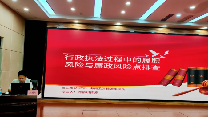 为进一步提升基层行政执法队伍的法治思维、规范化执法能力与廉政风险防控水平,近日,海南云常律师事务所律师刘鹏翔受三亚市综合行政执法局吉阳分局邀请,连续两天开展专题法律培训,围绕履职风险防控、文明执法边界、舆情应对以及行政法相关期限适用等重点内容进行系统讲授。本次培训在三亚市法学会指导支持下举行,旨在推动优质法律资源服务基层执法实践。