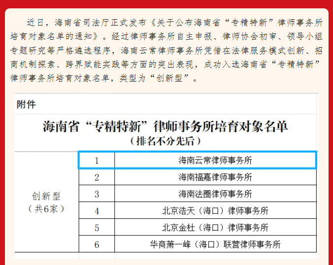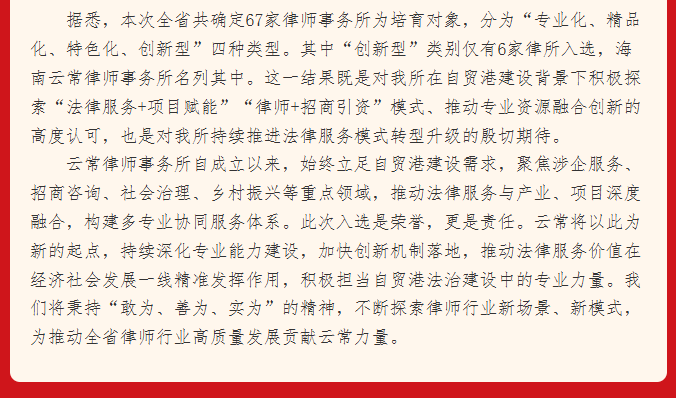 云常喜报 | 海南云常律师事务所入选海南省“专精特新”律所培育对象名单