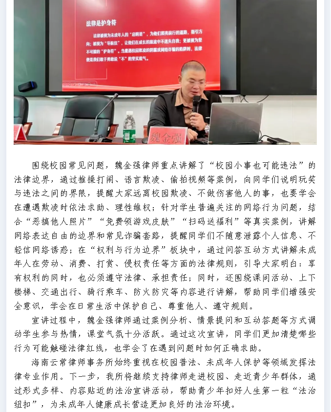 云常普法|守护青春不越线——我所魏金强律师走进桶井小学开展法治专题宣讲