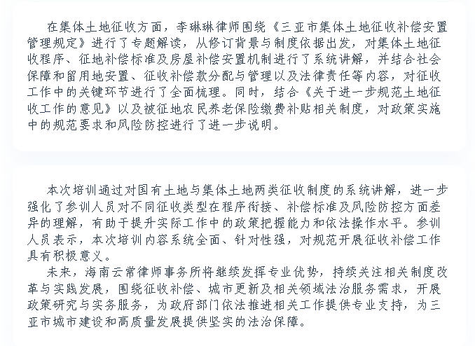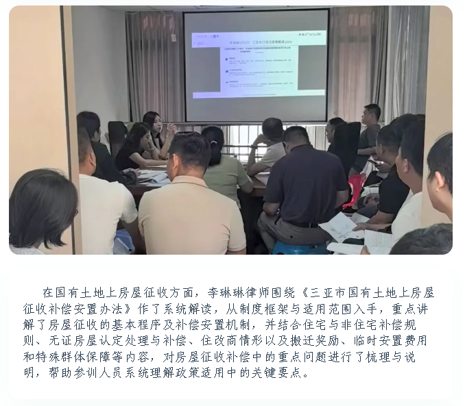 云常动态|聚焦征收补偿政策 提升依法履职能力——海南云常律所城市更新专项法律事务部受邀为吉阳区城市更新项目开展征收补偿业务培训