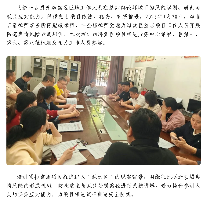 云常动态 | 我所陈冠璇律师、羊金强律师受邀开展海棠区重点项目防范舆情风险专题培训