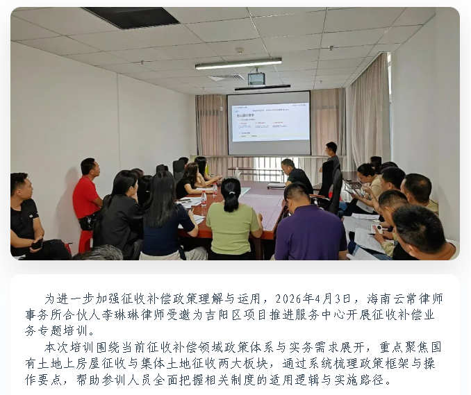 云常动态|聚焦征收补偿政策 提升依法履职能力——海南云常律所城市更新专项法律事务部受邀为吉阳区城市更新项目开展征收补偿业务培训